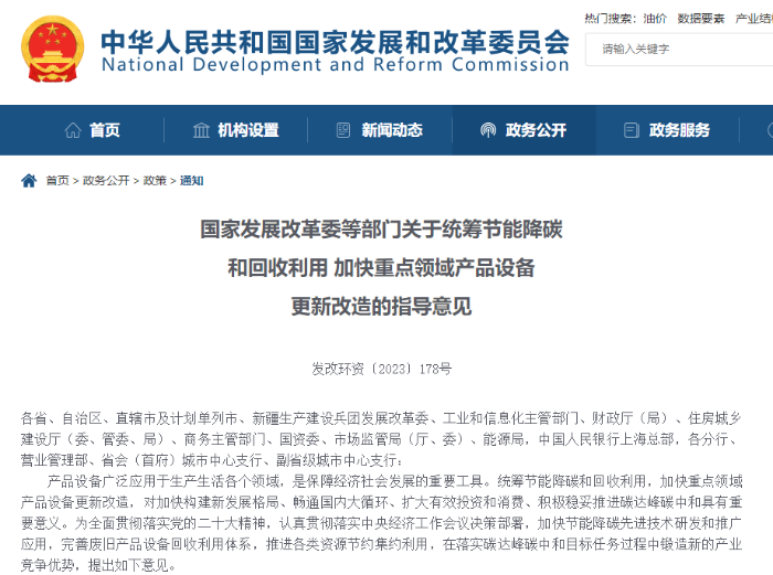 堅(jiān)持系統(tǒng)觀念 著力精準(zhǔn)施策 加快完善廢舊產(chǎn)品設(shè)備回收利用體系 ——《關(guān)于統(tǒng)籌節(jié)能降碳和回收利用 加快重點(diǎn)領(lǐng)域產(chǎn)品設(shè)備更新改造的指導(dǎo)意見》解讀 朱黎陽 完善廢舊產(chǎn)品設(shè)備回收利用體系,是貫徹落實(shí)黨的二十大報(bào)告關(guān)于“實(shí)施全面節(jié)約戰(zhàn)略,推進(jìn)各類資源節(jié)約集約利用,加快構(gòu)建廢棄物循環(huán)利用體系”的重要舉措。近日,國家發(fā)展改革委會(huì)同有關(guān)部門印發(fā)了《關(guān)于統(tǒng)籌節(jié)能降碳和回收利用 加快重點(diǎn)領(lǐng)域產(chǎn)品設(shè)備更新改造的指導(dǎo)意見》(發(fā)改環(huán)資〔2023〕178號(hào),以下簡稱《指導(dǎo)意見》),明確了統(tǒng)籌推進(jìn)產(chǎn)品設(shè)備更新改造和回收利用的目標(biāo)任務(wù)、政策措施和實(shí)施指南,是指導(dǎo)各地區(qū)和有關(guān)行業(yè)企業(yè)做好相關(guān)工作的重要文件。 01 堅(jiān)持系統(tǒng)施策,破解回收難題 當(dāng)前,我國正處在工業(yè)化和城鎮(zhèn)化深化發(fā)展的關(guān)鍵階段,將迎來新一輪產(chǎn)品設(shè)備更新升級(jí)高峰。隨著一批高性能、高效率、高質(zhì)量新產(chǎn)品投用,與之相應(yīng)將有一批產(chǎn)品設(shè)備陸續(xù)退役?;厥绽檬钱a(chǎn)品設(shè)備全生命周期中的重要一環(huán),規(guī)范回收是實(shí)現(xiàn)各類廢舊產(chǎn)品設(shè)備“物盡其用”的必要前提。如何實(shí)現(xiàn)成批廢舊產(chǎn)品設(shè)備的循環(huán)利用是擺在各方面前的現(xiàn)實(shí)問題。 《指導(dǎo)意見》堅(jiān)持系統(tǒng)觀念,順應(yīng)產(chǎn)業(yè)發(fā)展趨勢(shì)和特點(diǎn),精準(zhǔn)把握產(chǎn)業(yè)發(fā)展需求,以“規(guī)范化、規(guī)?;⒕?xì)化”為導(dǎo)向,結(jié)合產(chǎn)品設(shè)備更新潛力、廢舊設(shè)備利用途徑等,從產(chǎn)品設(shè)備更新改造到回收、拆解、利用等各個(gè)環(huán)節(jié),系統(tǒng)性提出完善回收利用體系的細(xì)化要求,強(qiáng)化資金、政策、標(biāo)準(zhǔn)、技術(shù)、監(jiān)管等全方位支撐保障,具有較強(qiáng)的指導(dǎo)性和可操作性。加快完善廢舊產(chǎn)品設(shè)備回收利用體系,補(bǔ)齊廢舊產(chǎn)品設(shè)備循環(huán)利用產(chǎn)業(yè)鏈短板,對(duì)提升廢棄物循環(huán)利用水平和協(xié)同推進(jìn)降碳、減污、擴(kuò)綠、增長具有重要意義。 02 堅(jiān)持依法依規(guī),強(qiáng)化規(guī)范回收 “規(guī)范化”是完善廢舊產(chǎn)品設(shè)備回收利用的第一優(yōu)先導(dǎo)向?!吨笇?dǎo)意見》強(qiáng)調(diào),要尊重客觀規(guī)律,堅(jiān)守安全底線,堅(jiān)持依法依規(guī),規(guī)范開展廢舊產(chǎn)品設(shè)備回收處置,并細(xì)化提出相關(guān)要求。 一是規(guī)范處置國有資產(chǎn)。要落實(shí)國務(wù)院國資委《關(guān)于企業(yè)國有資產(chǎn)交易流轉(zhuǎn)有關(guān)事項(xiàng)的通知》要求,完善國有廢舊產(chǎn)品設(shè)備資產(chǎn)處置制度,推動(dòng)企業(yè)高效、規(guī)范處置相關(guān)資產(chǎn)。二是規(guī)范開展回收經(jīng)營活動(dòng)。相關(guān)企業(yè)要按照《再生資源回收管理辦法》有關(guān)要求,進(jìn)行再生資源回收經(jīng)營者備案等。三是依法依規(guī)開展報(bào)廢處置。相關(guān)主體應(yīng)嚴(yán)格落實(shí)法律法規(guī)和標(biāo)準(zhǔn)要求,規(guī)范處置屬于強(qiáng)制淘汰、存在嚴(yán)重事故隱患、無改造維修價(jià)值的報(bào)廢產(chǎn)品設(shè)備,杜絕通過二手交易等方式重新流入市場。四是嚴(yán)格遵守生態(tài)環(huán)境保護(hù)相關(guān)法律法規(guī)和標(biāo)準(zhǔn)要求。比如,涉及處置含油變壓器的,應(yīng)有廢油回收儲(chǔ)存設(shè)備和相關(guān)處理措施;從事制冷劑回收利用等經(jīng)營活動(dòng)的,應(yīng)嚴(yán)格落實(shí)《消耗臭氧層物質(zhì)管理?xiàng)l例》有關(guān)要求;從事屬于危險(xiǎn)廢物的含汞廢舊照明設(shè)備回收利用經(jīng)營活動(dòng)的,應(yīng)具有危險(xiǎn)廢物經(jīng)營許可證等。 03 堅(jiān)持多方聯(lián)動(dòng),力爭應(yīng)收盡收 退役產(chǎn)品設(shè)備的型號(hào)多、數(shù)量大、分布廣,涉及各地區(qū)、各行業(yè)、各領(lǐng)域。以往在實(shí)踐中,一些退役產(chǎn)品設(shè)備存在規(guī)范回收利用比例較低、長期閑置、進(jìn)入不規(guī)范拆解處置渠道等問題。為統(tǒng)籌推進(jìn)產(chǎn)品設(shè)備更新改造和回收利用,《指導(dǎo)意見》堅(jiān)持問題導(dǎo)向,精準(zhǔn)施策,有針對(duì)性地提出了實(shí)現(xiàn)“規(guī)?;被厥盏娜舾膳e措。 一是加強(qiáng)信息共享。要求各地按照市場化法治化原則,組織開展廢舊產(chǎn)品設(shè)備回收處置供需對(duì)接,打破回收利用的信息壁壘。二是探索新型回收模式。支持發(fā)展廢舊產(chǎn)品設(shè)備回收、運(yùn)輸、拆解、利用一體化模式。同時(shí)發(fā)揮制度和體制優(yōu)勢(shì),支持供銷社系統(tǒng)探索廢舊產(chǎn)品設(shè)備回收利用的先進(jìn)模式。三是開展機(jī)制創(chuàng)新。在家用電器領(lǐng)域?qū)嵤吧a(chǎn)企業(yè)回收目標(biāo)責(zé)任制”,鼓勵(lì)各地建立“資源循