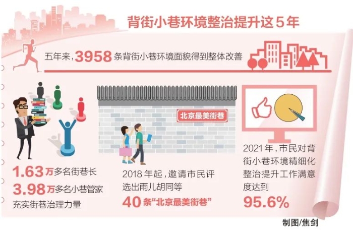 五年來,北京全市3958條背街小巷環(huán)境面貌得到整體改善;1.63萬多名街巷長、3.98萬多名小巷管家充實街巷治理力量;自2018年起,邀請市民評選出了雨兒胡同、府學胡同、鷂兒胡同、韶九胡同等40條“北京最美街巷”[5];首都文明辦、北京市城市管理委、北京市規(guī)劃和自然資源委命名了施家胡同、模式口南小街、祿米倉西巷等663條首都文明街巷[6];北京歷史文化名城保護委員會辦公室2022年正式公布了磚塔胡同、史家胡同、楊梅竹斜街、百花深處等598處首都功能核心區(qū)首批傳承悠久、具有相對完整歷史信息和較高歷史文化價值的街巷胡同傳統(tǒng)地名保護名錄[7]。市民對背街小巷環(huán)境精細化整治提升工作滿意率達到95.6%。