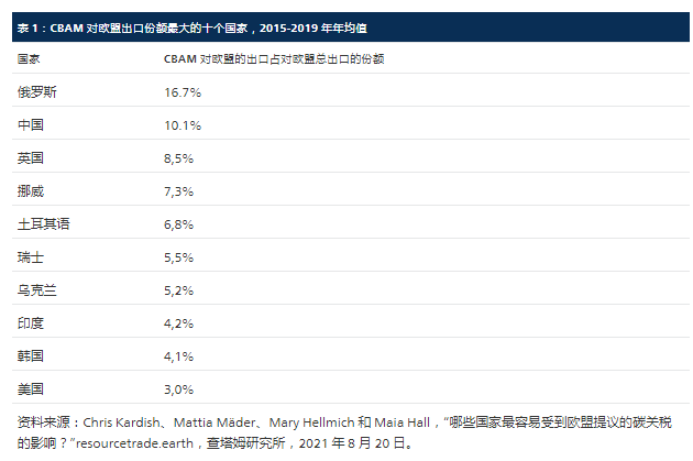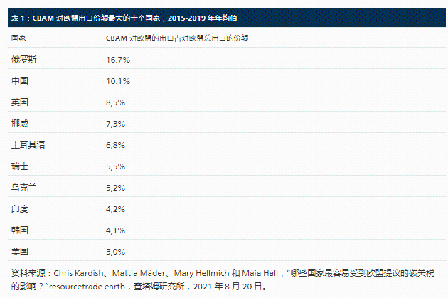 2015 年至 2019 年,十個主要國家的 CBAM 覆蓋的對歐盟出口的年平均份額從俄羅斯的近 17% 到美國的 3% 不等。(然而,挪威和瑞士這兩個排名前十的國家都是 ETS 的一部分,因此 CBAM 不適用于它們。)在 CBAM 涵蓋的行業(yè)中,對歐盟出口的近一半來自前五個國家。簡而言之,受該機(jī)制影響的 CBAM 產(chǎn)品對歐盟的最大出口國是俄羅斯、中國、英國、土耳其、烏克蘭、印度、韓國和美國。