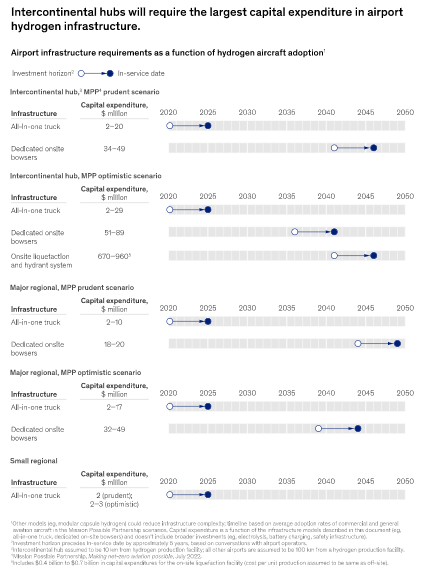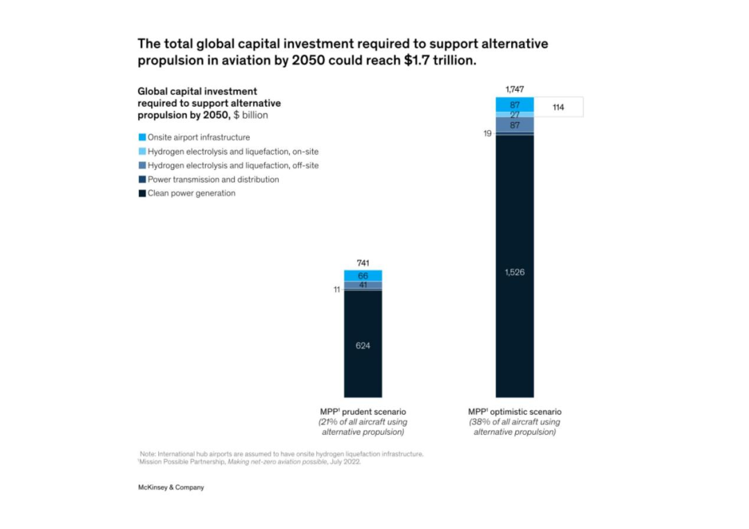 在向新型推進方式轉變的過程中,大型機場所需投資將明顯高于小型機場,但其規(guī)模與其他重大投資相似,如建造一個新航站樓。一個洲際樞紐預計到2050年在整個價值鏈上的投資總額約為39億美元,其中包括能源收購和氫氣生產,而一個主要的區(qū)域機場的投資約為13億美元。