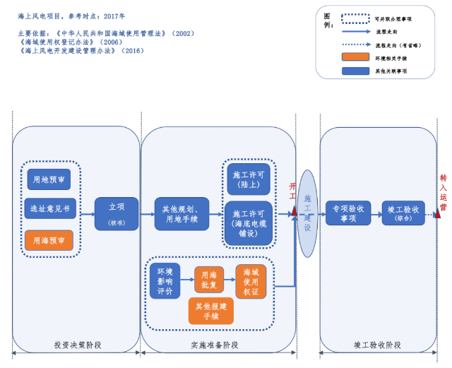 圖1 海上風(fēng)電項(xiàng)目專(zhuān)項(xiàng)手續(xù)要點(diǎn)及與其他事項(xiàng)的關(guān)聯(lián)(2017年) 根據(jù)《中華人民共和國(guó)海域使用管理法》(2002)以及《海域使用權(quán)登記辦法》(2006),國(guó)務(wù)院或國(guó)務(wù)院投資主管部門(mén)審批、核準(zhǔn)的建設(shè)項(xiàng)目需要使用海域的,申請(qǐng)人應(yīng)當(dāng)在項(xiàng)目審批、核準(zhǔn)前向國(guó)家海洋行政主管部門(mén)提出海域使用申請(qǐng),取得用海預(yù)審意見(jiàn)。在項(xiàng)目實(shí)施準(zhǔn)備階段,海域使用申請(qǐng)經(jīng)批準(zhǔn)后,由審核機(jī)關(guān)作出項(xiàng)目用海批復(fù)。海域使用申請(qǐng)人應(yīng)當(dāng)按項(xiàng)目用海批復(fù)要求辦理海域使用權(quán)登記,領(lǐng)取海域使用權(quán)證書(shū)。海域使用權(quán)證書(shū)是海域使用權(quán)的法律憑證。 以海上風(fēng)電項(xiàng)目為例,總結(jié)以2017年為參考時(shí)點(diǎn)的海域使用相關(guān)手續(xù)(如圖1所示)。需要強(qiáng)調(diào)的是,本流程圖以用海預(yù)審、用海批復(fù)、海域使用等手續(xù)為主線,主要為了闡明辦理該領(lǐng)域用海方面項(xiàng)目前期工作手續(xù)的意義,以及與相關(guān)要件最緊要相關(guān)的其他工作手續(xù)事項(xiàng),其他項(xiàng)目前期工作手續(xù)有省略。 根據(jù)2016年國(guó)家能源局、國(guó)家海洋局聯(lián)合印發(fā)的《海上風(fēng)電開(kāi)發(fā)建設(shè)管理辦法》(國(guó)能新能〔2016〕394號(hào)),海上風(fēng)電項(xiàng)目前期涉及的海域使用相關(guān)工作及要點(diǎn)有: 其一,項(xiàng)目單位向省級(jí)及以下能源主管部門(mén)申請(qǐng)核準(zhǔn)前,應(yīng)向海洋行政主管部門(mén)提出用海預(yù)審申請(qǐng),按規(guī)定程序和要求審查后,由海洋行政主管部門(mén)出具項(xiàng)目用海預(yù)審意見(jiàn)。 其二,海上風(fēng)電項(xiàng)目核準(zhǔn)后,項(xiàng)目單位應(yīng)按照程序及時(shí)向海洋行政主管部門(mén)提出海域使用申請(qǐng),依法取得海域使用權(quán)后方可開(kāi)工建設(shè)。 其三,項(xiàng)目開(kāi)工前,還應(yīng)落實(shí)有關(guān)利益協(xié)調(diào)解決方案或協(xié)議,完成通航安全、接入系統(tǒng)等相關(guān)專(zhuān)題的論證工作,并依法取得相應(yīng)主管部門(mén)的批復(fù)文件。 其四,項(xiàng)目單位在提出海域使用權(quán)申請(qǐng)前,應(yīng)當(dāng)委托有相應(yīng)資質(zhì)的機(jī)構(gòu)編制海上風(fēng)電項(xiàng)目環(huán)境影響報(bào)告書(shū),報(bào)海洋行政主管部門(mén)審查批準(zhǔn)。 其五,海上風(fēng)電項(xiàng)目建成后,按規(guī)定程序申請(qǐng)環(huán)境保護(hù)設(shè)施竣工驗(yàn)收,驗(yàn)收合格后,該項(xiàng)目方可正式投入運(yùn)營(yíng)。 附:特定行業(yè)領(lǐng)域?qū)m?xiàng)手續(xù)的主要政策清單(按文中出現(xiàn)先后順序) 1.國(guó)務(wù)院《關(guān)于印發(fā)清理規(guī)范投資項(xiàng)目報(bào)建審批事項(xiàng)實(shí)施方案的通知》(國(guó)發(fā)〔2016〕29號(hào)) 2.《中華人民共和國(guó)海域使用管理法》(2001年)(主席令第61號(hào)) 3.國(guó)家海洋局《海域使用申請(qǐng)審批暫行辦法》(國(guó)海發(fā)〔2002〕5號(hào)) 4.國(guó)家海洋局《海域使用權(quán)登記辦法》(國(guó)海發(fā)〔2002〕23號(hào)) 5.國(guó)家海洋局《海域使用權(quán)管理規(guī)定》(國(guó)海發(fā)〔2006〕27號(hào) ) 6.國(guó)家海洋局《海域使用權(quán)登記辦法》(國(guó)海發(fā)〔2006〕28號(hào)) 7.《中華人民共和國(guó)物權(quán)法》(2007年)(主席令第62號(hào)) 8.國(guó)家海洋局《關(guān)于開(kāi)展海域使用權(quán)管理統(tǒng)一配號(hào)有關(guān)事項(xiàng)的通知》(國(guó)海管字〔2017〕81號(hào)) 9.國(guó)家海洋局《關(guān)于海域、無(wú)居民海島有償使用的意見(jiàn)》(2018年) 10.自然資源部《關(guān)于實(shí)施海砂采礦權(quán)和海域使用權(quán)“兩權(quán)合一”招拍掛出讓的通知》(自然資規(guī)〔2019〕5號(hào)) 11.中共中央《深化黨和國(guó)家機(jī)構(gòu)改革方案》(2018年) 12.國(guó)務(wù)院《國(guó)務(wù)院關(guān)于取消和下放一批行政許可事項(xiàng)的決定》(國(guó)發(fā)〔2019〕6號(hào)) 13.國(guó)務(wù)院《中華人民共和國(guó)電信條例》(2000年)(國(guó)務(wù)院令第291號(hào)) 14.信息產(chǎn)業(yè)部《電信業(yè)務(wù)經(jīng)營(yíng)許可證管理辦法》(2001年)(信息產(chǎn)業(yè)部令第19號(hào)) 15.工業(yè)和信息化部《電信業(yè)務(wù)經(jīng)營(yíng)許可管理辦法》(2009年)(工業(yè)和信息化部令第5號(hào)) 16.工業(yè)和信息化部《電信業(yè)務(wù)經(jīng)營(yíng)許可管理辦法》(2017年)(工業(yè)和信息化部令第42號(hào)) 17.國(guó)務(wù)院《中華人民共和國(guó)電信條例》(2014年)(國(guó)務(wù)院令第653號(hào)) 18.國(guó)務(wù)院《中華人民共和國(guó)電信條例》(2016年)(國(guó)務(wù)院令第666號(hào)) 19.國(guó)務(wù)院《關(guān)于取消和下放一批行政審批項(xiàng)目的決定》(國(guó)發(fā)〔2014〕5號(hào)) 20.國(guó)務(wù)院《關(guān)于印發(fā)注冊(cè)資本登記制度改革方案的通知》(國(guó)發(fā)〔2014〕7號(hào)) 21.國(guó)務(wù)院《關(guān)于“先照后證”改革后加