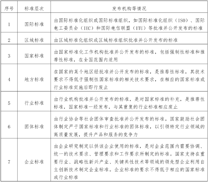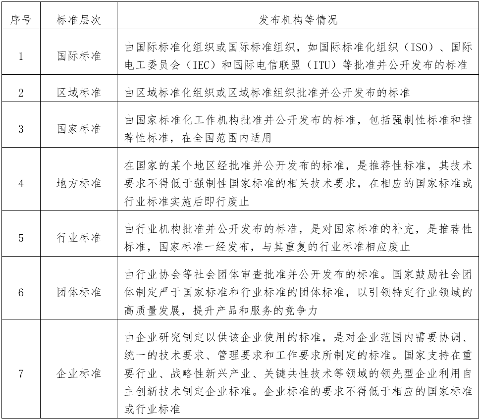 根據(jù)GB/T 20000.1-2014的相關(guān)規(guī)定,按照標(biāo)準(zhǔn)化所涉及的地理、政治或經(jīng)濟(jì)區(qū)域的范圍,可將標(biāo)準(zhǔn)化分為國(guó)際、區(qū)域、國(guó)家、行業(yè)、地方、團(tuán)體和企業(yè)等層次。即標(biāo)準(zhǔn)化可在全球、區(qū)域或國(guó)家層次上,在一個(gè)國(guó)家的某個(gè)地區(qū)內(nèi),在政府部門、行業(yè)協(xié)會(huì)或企業(yè)層次上,以至于在企業(yè)內(nèi)部業(yè)務(wù)處室等各個(gè)不同層次上進(jìn)行。根據(jù)標(biāo)準(zhǔn)發(fā)布機(jī)構(gòu)隸屬的標(biāo)準(zhǔn)化層級(jí),可將標(biāo)準(zhǔn)分為國(guó)際、區(qū)域、國(guó)家、行業(yè)、地方、團(tuán)體、企業(yè)標(biāo)準(zhǔn)等層次?!吨腥A人民共和國(guó)標(biāo)準(zhǔn)化法》明確企業(yè)標(biāo)準(zhǔn)的技術(shù)要求不得低于強(qiáng)制性國(guó)家標(biāo)準(zhǔn),鼓勵(lì)企業(yè)制定高于推薦性標(biāo)準(zhǔn)(包括推薦性國(guó)家標(biāo)準(zhǔn)、行業(yè)標(biāo)準(zhǔn)、地方標(biāo)準(zhǔn)、團(tuán)體標(biāo)準(zhǔn))相關(guān)技術(shù)要求的企業(yè)標(biāo)準(zhǔn)。我國(guó)要求實(shí)施標(biāo)準(zhǔn)化工作領(lǐng)跑者計(jì)劃,鼓勵(lì)領(lǐng)先型企業(yè)制定發(fā)布高于國(guó)家標(biāo)準(zhǔn)、行業(yè)標(biāo)準(zhǔn)、地方標(biāo)準(zhǔn)、團(tuán)體標(biāo)準(zhǔn)要求的企業(yè)標(biāo)準(zhǔn)。