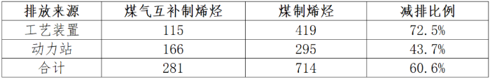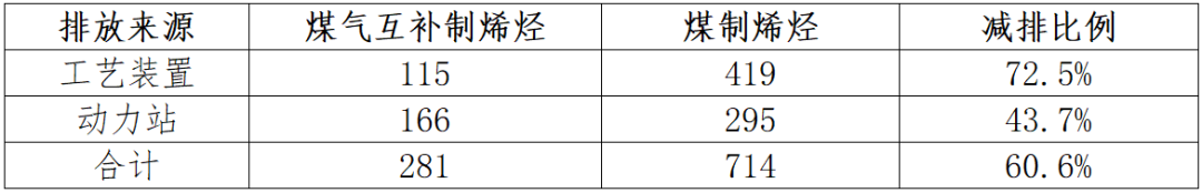 表1 同規(guī)模煤氣互補(bǔ)與煤制烯烴碳排放量對(duì)比表  單位:萬噸/年