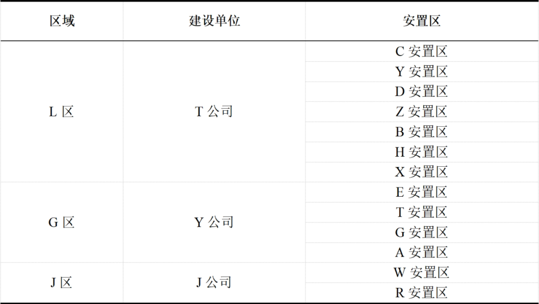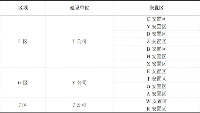 B市城改項(xiàng)目規(guī)劃總建筑面積約320萬(wàn)平方米,包含L區(qū)、G區(qū)和J區(qū)在內(nèi)的三區(qū)共十二個(gè)村莊的精裝修安置房、幼兒園、鄰里中心及周邊市政道路等配套基礎(chǔ)設(shè)施建設(shè)等,具體參建單位與安置區(qū)建設(shè)數(shù)據(jù),如表1