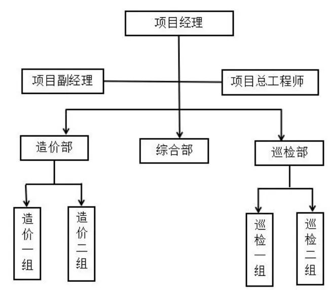 根據(jù)項(xiàng)目特點(diǎn)及實(shí)際需求,B市城改項(xiàng)目執(zhí)行過(guò)程中成立現(xiàn)場(chǎng)項(xiàng)目部。項(xiàng)目部分為造價(jià)部、巡檢部和綜合部 3 個(gè)工作部門,共同負(fù)責(zé)、完成全過(guò)程咨詢工作,項(xiàng)目部組織架構(gòu)見(jiàn)圖1。