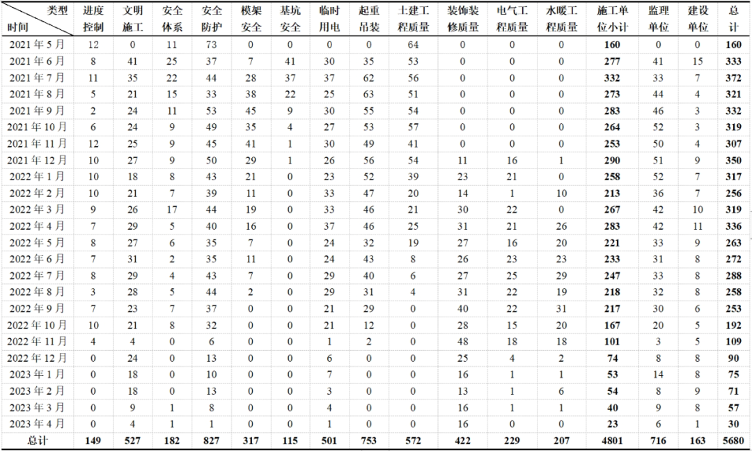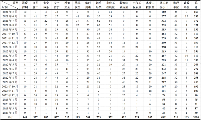 自2021年4月B市城改項(xiàng)目破土動(dòng)工開(kāi)始至2023年5月所有安置區(qū)公共建筑及附屬設(shè)施施工完成為止,B市城改全過(guò)程工程咨詢項(xiàng)目部共對(duì)安置區(qū)參建單位進(jìn)行了24輪巡視檢查工作。共完成常規(guī)巡檢任務(wù)393次、風(fēng)險(xiǎn)專項(xiàng)巡檢任務(wù)35次,形成巡視檢查記錄表428份,共檢查出現(xiàn)場(chǎng)施工單位、監(jiān)理單位及建設(shè)單位管理問(wèn)題5680項(xiàng),其中:建設(shè)單位問(wèn)題163項(xiàng),監(jiān)理單位問(wèn)題716項(xiàng),施工單位問(wèn)題4801項(xiàng)(進(jìn)度控制問(wèn)題149項(xiàng),安全管理問(wèn)題3222項(xiàng),質(zhì)量管理問(wèn)題1430項(xiàng)),具體巡視檢查數(shù)據(jù)如表2所示。