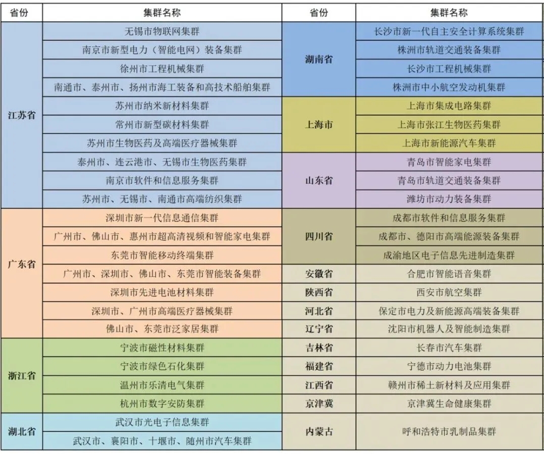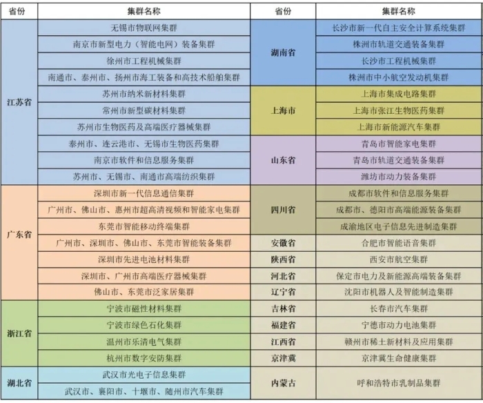 工業(yè)和信息化部于2019年啟動先進(jìn)制造業(yè)集群培育工作,采用“賽馬”方式遴選在輻射帶動產(chǎn)業(yè)鏈上下游和支撐區(qū)域經(jīng)濟(jì)發(fā)展方面發(fā)揮突出作用的集群,至2022年分三批次共認(rèn)定了45個國家級先進(jìn)制造業(yè)集群。涉及了傳統(tǒng)產(chǎn)業(yè)和新興產(chǎn)業(yè)布局,如:傳統(tǒng)產(chǎn)業(yè)領(lǐng)域有浙江寧波綠色石化集群、內(nèi)蒙古呼和浩特乳制品集群、湖南長沙工程機(jī)械集群等,新興產(chǎn)業(yè)有上海集成電路集群、京津冀生命健康集群、陜西西安航空集群、深圳新一代信息通信集群等。