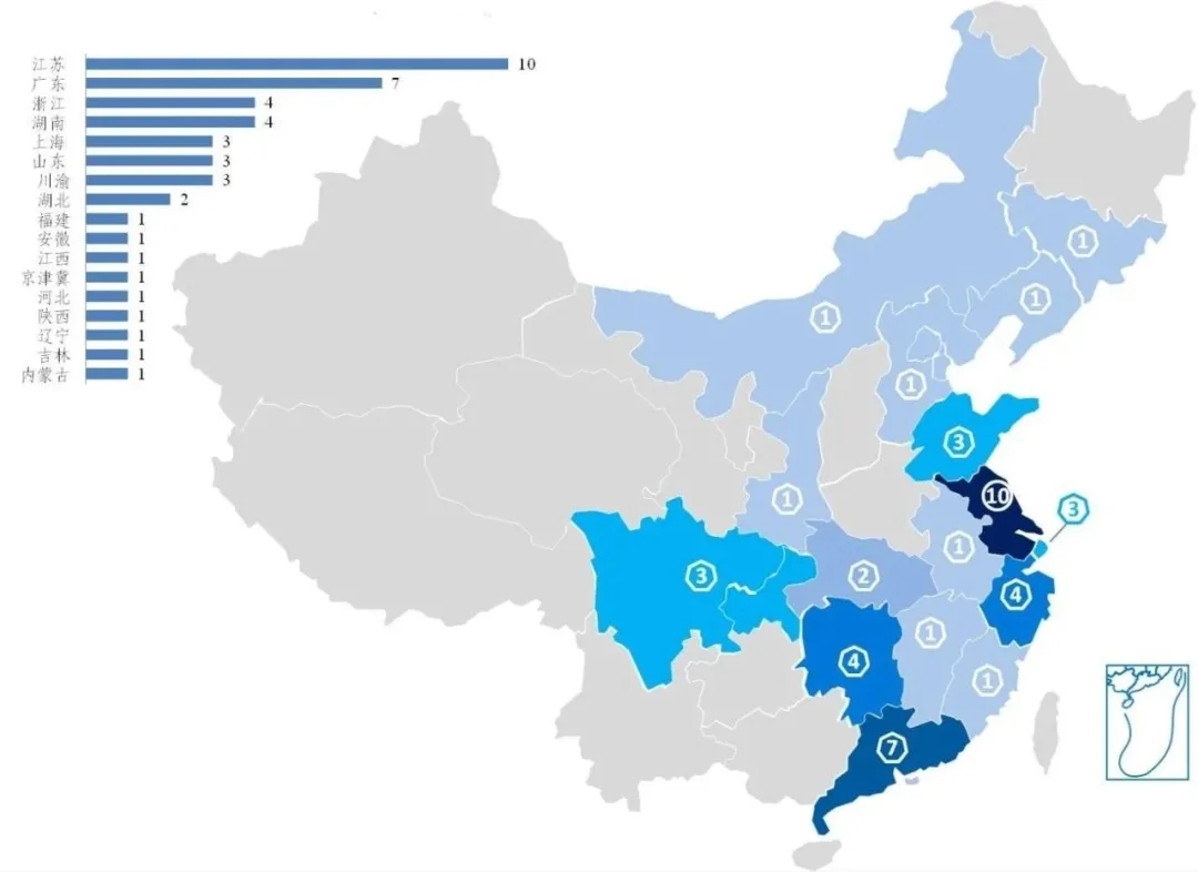 在空間分布上,呈現(xiàn)出東南沿海密集、東北西北稀疏以及與城市綜合競爭力強(qiáng)市重疊分布的特點(diǎn)。在全國31個?。ㄗ灾螀^(qū)、直轄市)中,集群涉及到省級單位19個、計(jì)劃單列市3個。其中,江蘇省擁有10個國家級先進(jìn)制造業(yè)集群,數(shù)量最多,其次是廣東省,擁有7個國家級先進(jìn)制造業(yè)集群。具體集群名稱詳見附表。