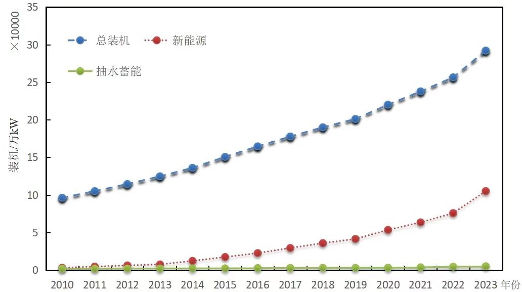 圖1 我國(guó)電力、新能源和抽水蓄能裝機(jī)規(guī)模增長(zhǎng)情況