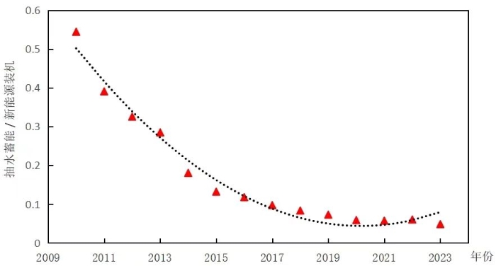 由圖1可見,抽水蓄能相比于電力和新能源的裝機(jī)規(guī)模增長(zhǎng)明顯偏慢。圖2和圖3分別顯示新能源和抽水蓄能“十二五”以來裝機(jī)規(guī)模的增長(zhǎng)情況,雖然抽水蓄能占電力總裝機(jī)比例總體維持在1.7%左右,但相比于新能源規(guī)模年均34%的增產(chǎn)率,抽水蓄能年均增長(zhǎng)率僅有9.6%。圖4顯示了2010年以來抽水蓄能與新能源裝機(jī)對(duì)比變化情況,二者裝機(jī)比例從2010年的54%下滑至2023年的4.8%。