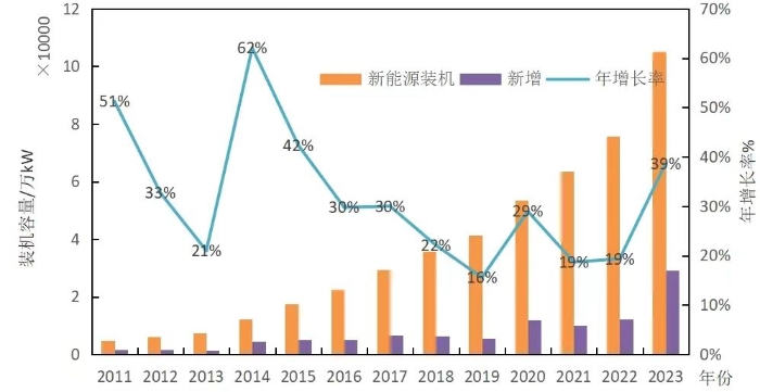 圖2 2011-2023年我國(guó)新能源裝機(jī)規(guī)模變化趨勢(shì)