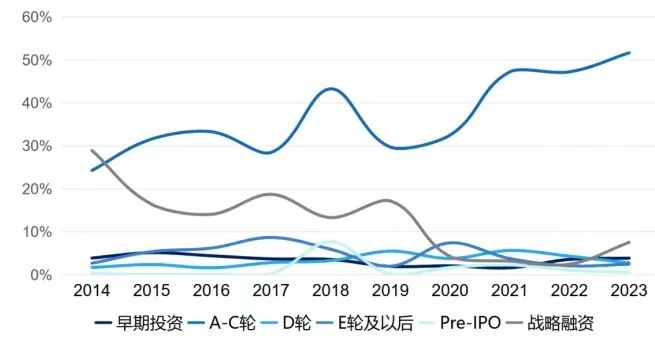 圖3 2014-2023年中國VC/PE市場投資各輪次案例數(shù)量比重變化