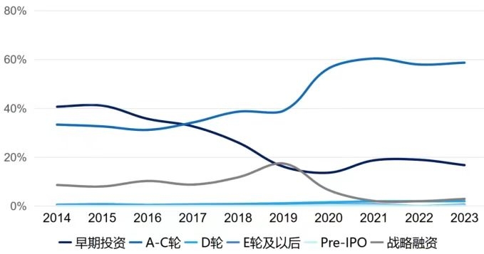 圖4 2014-2023年中國VC/PE市場投資各輪次交易規(guī)模比重變化