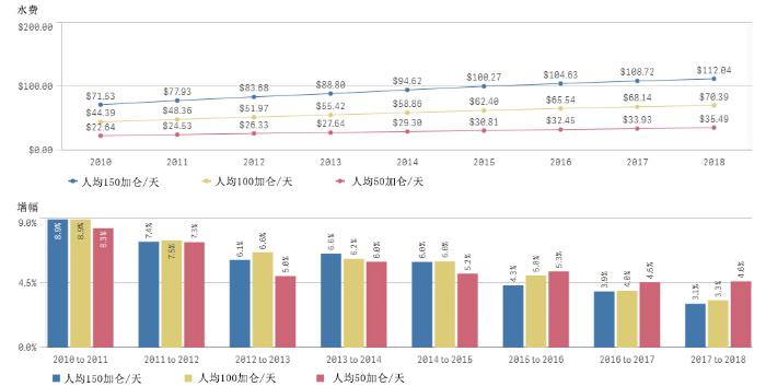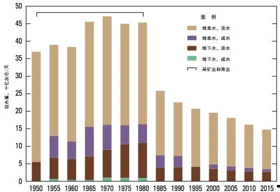 編者按:《2021年聯(lián)合國(guó)世界水發(fā)展報(bào)告》提出,全球新水使用量在過(guò)去100年中增加了6倍,自20世紀(jì)80年代以來(lái)以每年約1%的速度增加。預(yù)計(jì)至2050年全球用水量仍將以類似的速度繼續(xù)增長(zhǎng),且增長(zhǎng)主要集中在中低收入國(guó)家,尤其是新興經(jīng)濟(jì)體[1]。 為進(jìn)一步把握好我國(guó)水資源未來(lái)需求趨勢(shì),我們深入分析研究了一些典型國(guó)家的用水態(tài)勢(shì)變化情況及水資源管理經(jīng)驗(yàn),以期為我國(guó)做好水資源需求研判以及科學(xué)指導(dǎo)水工程規(guī)劃建設(shè)提供參考。本公眾號(hào)將研究成果以系列文章的方式陸續(xù)刊發(fā),本文為系列研究之一,供業(yè)界同仁參考。 美國(guó)用水變化態(tài)勢(shì)對(duì)我國(guó)的啟示 姜富華 邢智慧 紀(jì)興華 一、1950年以來(lái)美國(guó)用水量變化態(tài)勢(shì)分析 (一)1950年以來(lái)美國(guó)用水量變化情況 2015年美國(guó)總用水量約為4449億立方米,其中淡水約為3883億立方米,占比為87%;咸水約為566億立方米,占比為13%。 從1950年至2015年間美國(guó)總用水量的變化情況看,其總體呈先增后降的態(tài)勢(shì)(見(jiàn)圖1)。以1980年為轉(zhuǎn)折點(diǎn),1950-1980年間美國(guó)總用水量隨著人口和經(jīng)濟(jì)的增長(zhǎng)持續(xù)增長(zhǎng),1980年美國(guó)總用水量約為1950年的2.4倍;1980年以后,受產(chǎn)業(yè)結(jié)構(gòu)調(diào)整、技術(shù)進(jìn)步、用水效率提高等因素綜合影響,美國(guó)總用水量呈現(xiàn)了總體下降的態(tài)勢(shì),2015年總用水量比用水高峰的1980年減少了約25%。 美國(guó)淡水取用量與總用水量變化態(tài)勢(shì)一致(見(jiàn)圖2)。1980-2015年間美國(guó)淡水總用水量下降了27%,此期間美國(guó)人口增長(zhǎng)了約42%,GDP增長(zhǎng)了5倍以上[2]。 數(shù)據(jù)來(lái)源:美國(guó)地質(zhì)調(diào)查局統(tǒng)計(jì)。 注:①不同時(shí)段取水量統(tǒng)計(jì)口徑略有差異;②取水量等于毛用水量。 圖1 1950-2015年美國(guó)總?cè)∮盟考胺诸惾∮盟孔兓瘧B(tài)勢(shì) 數(shù)據(jù)來(lái)源:美國(guó)地質(zhì)調(diào)查局統(tǒng)計(jì)。 圖2 1950-2015年美國(guó)淡水取用水量與人口變化態(tài)勢(shì) 有研究[3]繪制了以1950年為基準(zhǔn),至2010年美國(guó)GDP與用水量間的關(guān)系變化情況圖(見(jiàn)圖3)。藍(lán)色線為實(shí)際GDP變化,橙色線為實(shí)際用水量變化,灰色線為考慮產(chǎn)業(yè)結(jié)構(gòu)變化、不考慮技術(shù)改進(jìn)情況下的預(yù)測(cè)用水變化。藍(lán)色線與橙色線的剪刀走向表明:早在1980年,美國(guó)用水量已與GDP脫鉤。藍(lán)色線與灰色線、灰色線與橙色線的剪刀走向表明:導(dǎo)致脫鉤的重要因素是用水效率提升和經(jīng)濟(jì)結(jié)構(gòu)變化。 數(shù)據(jù)來(lái)源:數(shù)據(jù)來(lái)自[3];1950=1 圖3 1950-2010年美國(guó)總用水量與經(jīng)濟(jì)變化關(guān)系分析 (二)主要行業(yè)用水量變化情況 美國(guó)用水類別中,熱電、灌溉、公共和自供工業(yè)用水量是排在前4名的用水戶,其用水總量占美國(guó)總用水量的比重超過(guò)90%,見(jiàn)圖4。本文重點(diǎn)分析多年來(lái)美國(guó)熱電、灌溉、公共和自供工業(yè)用水的變化情況。 數(shù)據(jù)來(lái)源:美國(guó)地質(zhì)調(diào)查局。 圖4 2015年美國(guó)分類取用水量統(tǒng)計(jì) 1.熱電用水變化態(tài)勢(shì) 熱電是美國(guó)最大的用水對(duì)象。2015年美國(guó)熱電用水量約為1838億立方米,占總用水量的41%左右,見(jiàn)圖5。美國(guó)熱電用水基本來(lái)自地表水,且以淡水為主。2015年美國(guó)熱電用水量比2010年降低18%左右,用水效率由2010年的71.9升/千瓦時(shí)降低到2015年的56.8升/千瓦時(shí)。 數(shù)據(jù)來(lái)源:美國(guó)地質(zhì)調(diào)查局。 圖5 1950-2015年美國(guó)熱電用水量變化態(tài)勢(shì) 2.灌溉用水變化態(tài)勢(shì) 美國(guó)灌溉用水量占總用水量的40%左右,僅次于熱電用水。2015年美國(guó)灌溉面積超過(guò)3.5億畝,其中噴灌、微灌面積比重分別為55%和8.6%左右,灌溉總用水量約為1630億立方米(占總用水量的37%左右),地表和地下水源灌溉供水比重分別為52%和48%。由于降雨豐枯變化,美國(guó)灌溉水量年際間有波動(dòng),但從大的變化趨勢(shì)看,1980年以來(lái)總體呈下降趨勢(shì),2015年灌溉水量比1980年減少了21%,見(jiàn)圖6。 數(shù)據(jù)來(lái)源:美國(guó)地質(zhì)調(diào)查局。 圖6 1950-2015年美國(guó)灌溉用水量變化態(tài)勢(shì) 灌溉用水受水資源條件、灌溉面積、種植結(jié)構(gòu)、灌溉設(shè)施、灌溉效率等多種因素影響。據(jù)美國(guó)農(nóng)業(yè)部統(tǒng)計(jì),美國(guó)灌溉面積快速增長(zhǎng),從1890年的不足1821萬(wàn)畝增長(zhǎng)到2017年的3.52億畝左右,見(jiàn)圖7。但與此同時(shí),實(shí)際灌溉用水強(qiáng)度有所下降,1969-2017年單位面積平均灌溉水量從406立方米/畝下降至304立方米/畝,這是農(nóng)業(yè)種植模式調(diào)整、灌溉設(shè)施與技術(shù)采用和灌溉效率提高等綜合作用的結(jié)果。 數(shù)據(jù)來(lái)源:美國(guó)農(nóng)業(yè)部。 圖7 1890-2018年美國(guó)灌溉面積和單位面積灌溉用水量變化態(tài)勢(shì) 美國(guó)灌溉用水結(jié)構(gòu)不斷變化,主要表