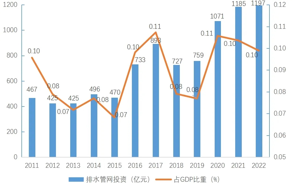 建設(shè)投資方面,我國排水管網(wǎng)投資總體上穩(wěn)中有升,但城市排水基礎(chǔ)設(shè)施的建設(shè)跟不上城市發(fā)展的步伐。在人均排水管道占有量、管網(wǎng)密度上,我國與發(fā)達國家相比仍有不小差距。根據(jù)《中國城市建設(shè)統(tǒng)計年鑒》的數(shù)據(jù)顯示,截至2022年底,我國已建成的城市排水管道總長度為91.35萬公里,同比增長4.73%;人均排水管網(wǎng)長度約1.94米(按城區(qū)人口計算),建成區(qū)排水管道密度為12.34公里/平方公里;城市生活污水集中收集率70.06%,比上年增加1.47個百分點。國外發(fā)達國家城市排水系統(tǒng)規(guī)劃建設(shè)較早,現(xiàn)已發(fā)展較為成熟。據(jù)資料記載,2002年,德國城市排水管道長度總計達到44.6萬公里,人均長度為5.44米,城市排水管網(wǎng)密度平均在10公里/平方公里以上,城市污水納管率平均高達93.2%;2002年,美國城市排水管道長度大約150萬公里,人均長度為4米以上,城市排水管網(wǎng)密度平均在15公里/平方公里以上;2004年,日本城市排水管道長度已達到35萬公里,排水管網(wǎng)密度一般在20~30公里/平方公里,高的地區(qū)可達50公里/平方公里。