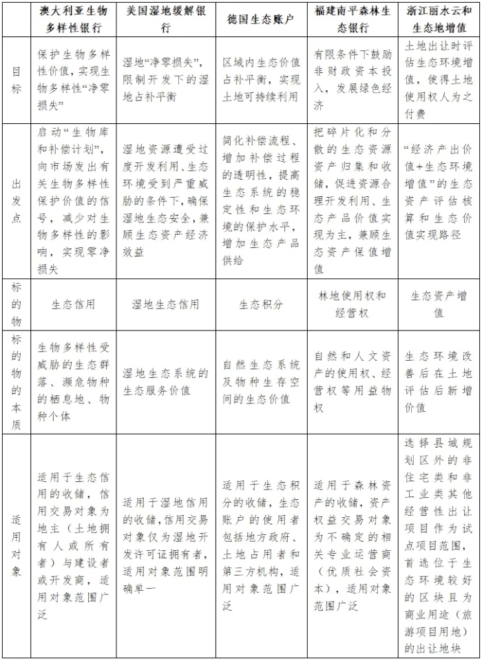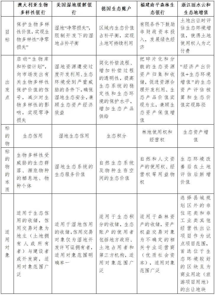 總之,國內(nèi)外針對(duì)生態(tài)券制度目前并沒有明確的定義,實(shí)踐中各國各地都是基于自身情況設(shè)計(jì)了具體的制度形式和內(nèi)容。我們認(rèn)為目前最能反映生態(tài)券價(jià)值的是澳大利亞的生物多樣性銀行、美國的濕地銀行以及德國的生態(tài)賬戶。盡管在政策目標(biāo)、出發(fā)點(diǎn)、交易標(biāo)的物等方面存在不同(見表1),它們的共同點(diǎn)是均為由政府搭建的專門對(duì)產(chǎn)權(quán)清晰的自然資源生態(tài)權(quán)屬進(jìn)行交易的平臺(tái),主要使命是對(duì)經(jīng)濟(jì)建設(shè)和開發(fā)活動(dòng)造成的對(duì)生態(tài)系統(tǒng)或生物多樣性的負(fù)面影響進(jìn)行修復(fù)或者補(bǔ)償,促進(jìn)“生物多樣性中和”或者“生態(tài)中和”,最終實(shí)現(xiàn)“自然資本增值”或“生物多樣性凈增益”。需要指出的是,生態(tài)券制度得以運(yùn)行的基礎(chǔ)是法制上對(duì)生態(tài)保護(hù)凈零損失或者生物多樣性中和的強(qiáng)制性要求;生態(tài)資源資產(chǎn)化得以可持續(xù)的還是需要形成規(guī)模化的生態(tài)產(chǎn)業(yè),其基礎(chǔ)在于生態(tài)資源交易市場(chǎng)的構(gòu)建以及為保證交易配套的制度。