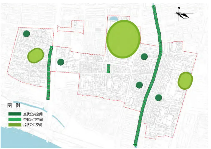 古城臨近宋河水系,周邊有山體公園、濱江公園以及小游園,開(kāi)放空間類型較豐富(圖4)。目前只有中山公園的1公里服務(wù)范圍全覆蓋了古城規(guī)劃地區(qū),基本滿足“500米見(jiàn)綠、1000米達(dá)園”的綠地布局要求,和構(gòu)建“園在城中、城在園中、城園一體、園城共融”的現(xiàn)代田園型都市的目標(biāo)。