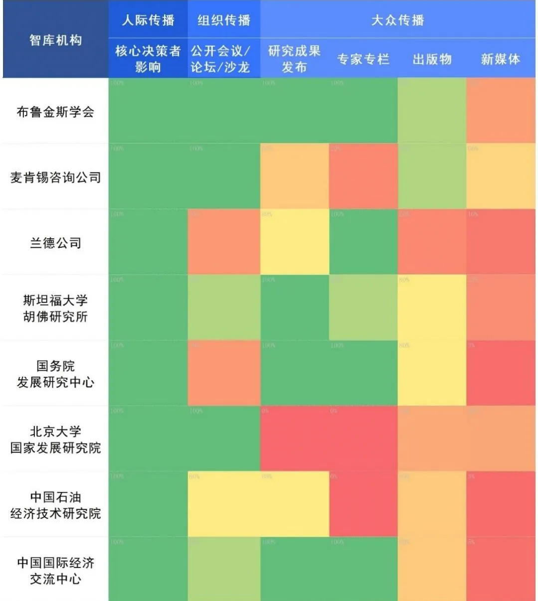 一般情況下三種傳播方式同時采用,互為補充和促進,人際傳播有助于研究成果直接影響決策者,也是智庫影響“精英決策者”的傳統方式;組織傳播和大眾傳播擔負著塑造公共輿論和社會形象的作用,從而起到間接影響決策者的作用。