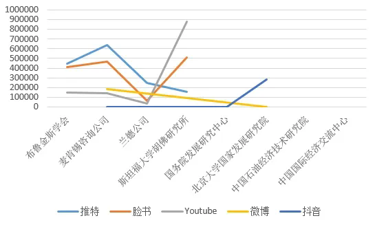 隨著互聯網和大數據時代的到來,新媒體矩陣作為大眾傳播有效和經濟的方式,越來越受到重視。分析中選取了主流國際和國內新媒體典型代表(信息類推特、微博、臉書、微信,以及流媒體類Youtube及抖音),通過對訂閱者數量、發(fā)布數量、日發(fā)布頻率、閱讀/觀看次數、獲贊數量等指標進行綜合量化分析,構建了國內外智庫的新媒體矩陣綜合影響力模型(見圖2、圖3、圖4、圖5)。
