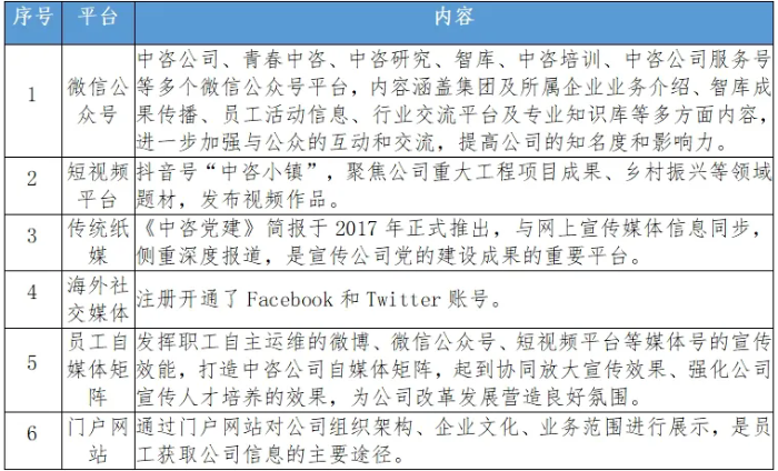 中咨公司總部及所屬企業(yè)共有線上線下主要宣傳媒體29個,包括門戶網站、微信公眾號、短視頻平臺、傳統紙媒、員工自媒體矩陣、融媒體生產平臺等。