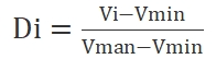 其中:Vman為指標V在行業(yè)或獲取數(shù)據(jù)中的最大值,Vmin為指標V在行業(yè)或獲取數(shù)據(jù)中的最小值,Vi為企業(yè)i的指標V的數(shù)值。