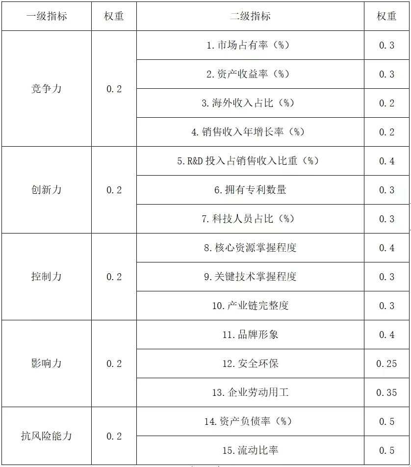 為客觀公正評價三家企業(yè)的綜合實力,采用德爾菲法,研究確定了各級指標的權重。具體如下: