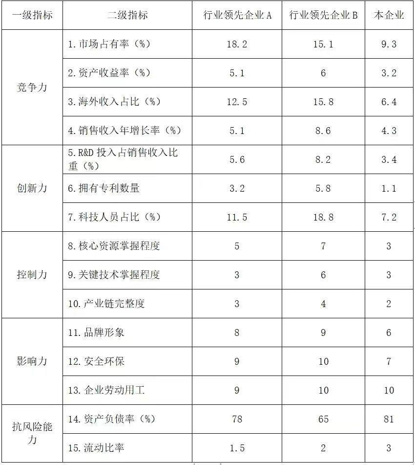 企業(yè)選擇A、B兩家行業(yè)領先企業(yè)作為標桿對象,競爭力、創(chuàng)新力、抗風險能力作為客觀指標,從相關企業(yè)年報獲取,控制力和影響力采用主觀指標,運用專家評價法,組織若干管理專家對相關企業(yè)進行打分,各單項滿分為10分。各企業(yè)具體得分如下: